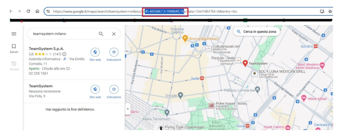 compilando i campi richiesti; i campi Latitudine e Longitudine dovranno rispettare l’url di google Maps, come nell’esempio sotto riportato: