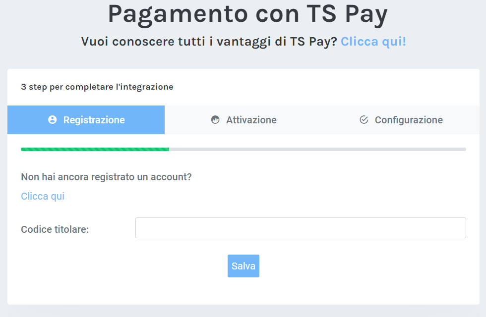 Una volta attivato, potrai abilitarlo all'interno del backoffice del tuo store dal percorso IMPOSTAZIONI PAGAMENTI, selezionando il tasto Gestisci TSPay, inserendo il tuo Codice Titolare (fornito da TSPay) e completando gli step indicati: