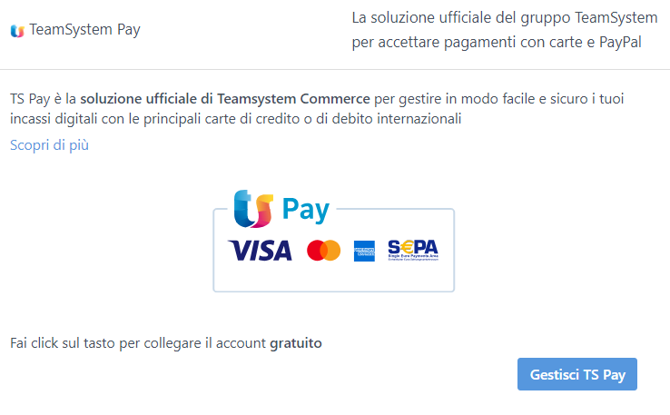 TeamSystem Pay è la soluzione di pagamento nativa di TeamSystem Commerce; è integrato gratuitamente con il tuo account e ti permette di scegliere tra vari tipi di gateway di pagamento, tra cui: