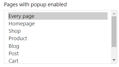 L'app ti consente di scegliere su quale pagina vorrai far comparire il popup, se su tutte le pagine del sito o su pagine specifiche, alla sezione Pages with popup enable: