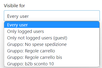 Potrai, inoltre, indicare i destinatari della visualizzazione del popup, se tutti gli utenti che accedono al sito o solo gli utenti registrati (previo accesso con le proprie credenziali), tramite la sezione Visibile for; nel caso in cui in TS Commerce avessi configurato dei Gruppi di clienti (ad esempio clienti B2B), potrai, ad esempio, scegliere se rendere visibile il popup solo a questo specifico target: