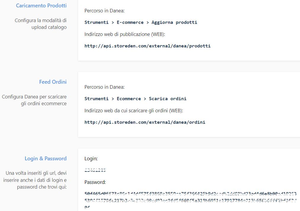 - Per sincronizzare il catalogo, all'interno del gestionale vai su Strumenti >> Aggiorna prodotti su e-commerce >> Impostazioni ed incolla le credenziali che trovi all'interno del plug-in di TeamSystem Commerce alle sezioni Caricamento Prodotti e Login & Password;