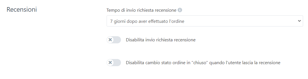 Potrai definire se lasciare abilitato il servizio oppure disattivarlo, dopo quanto tempo inviare l'email (guarda qui come configurarne il testo) e disabilitare il cambio stato dell'ordine dopo la recensione.