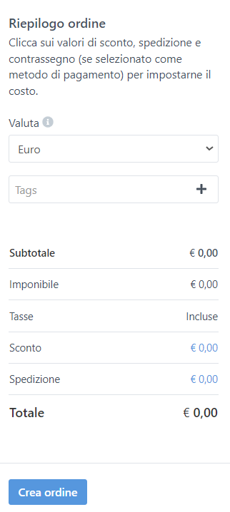 Dalla sezione Ordini del tuo pannello di gestione potrai creare un ordine manualmente; per farlo clicca il tasto +Crea ordine: