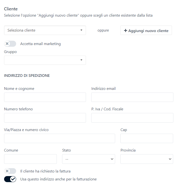 Una volta cliccato su Aggiungi, potrai selezionare il cliente a cui associare l'ordine, se già registrato, oppure aggiungere un nuovo cliente con la relativa anagrafica.