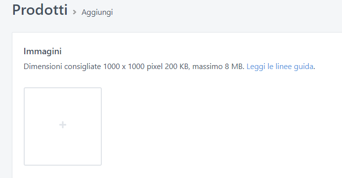 Le immagini del prodotto possono essere aggiunte selezionando i box aggiuntivi (+) posti a fianco dell'immagine principale.