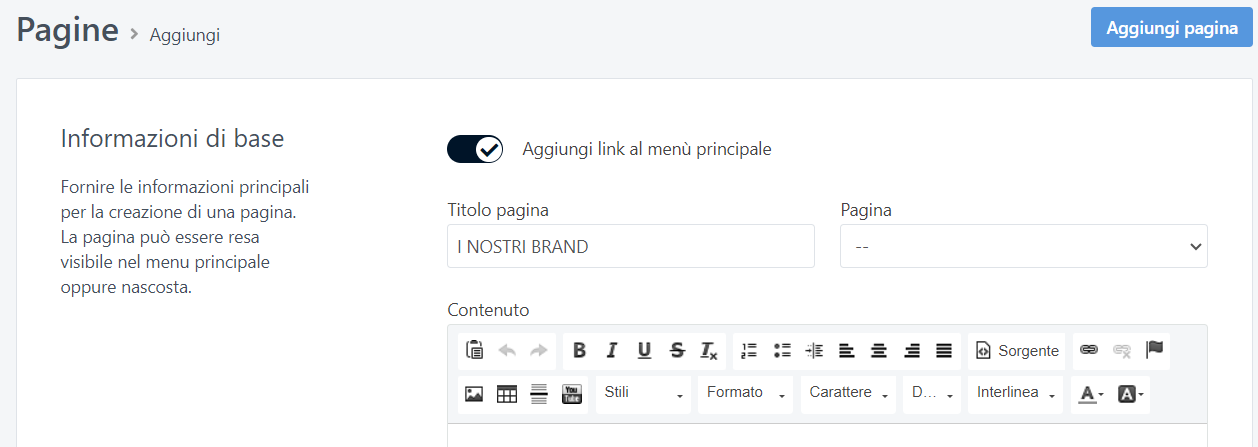 - Entra nella sezione ECOMMERCE > PAGINE e crea una nuova pagina I nostri brands: