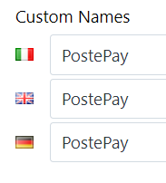 Potrai personalizzare la label del metodo di pagamento visibile nel checkout, compilando il campo Custom Names, per tutte le lingue previste all'interno del tuo sito: