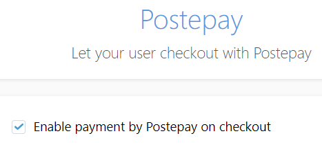 Contatta il tuo commerciale di riferimento per effettuarne l'acquisto; una volta scaricata dall'Apps Market, potrai visualizzarla al percorso Impostazioni > Pagamenti > PostePay ed abilitarla inserendo la spunta in corrispondenza della voce Enable payment by Postepay on checkout:
