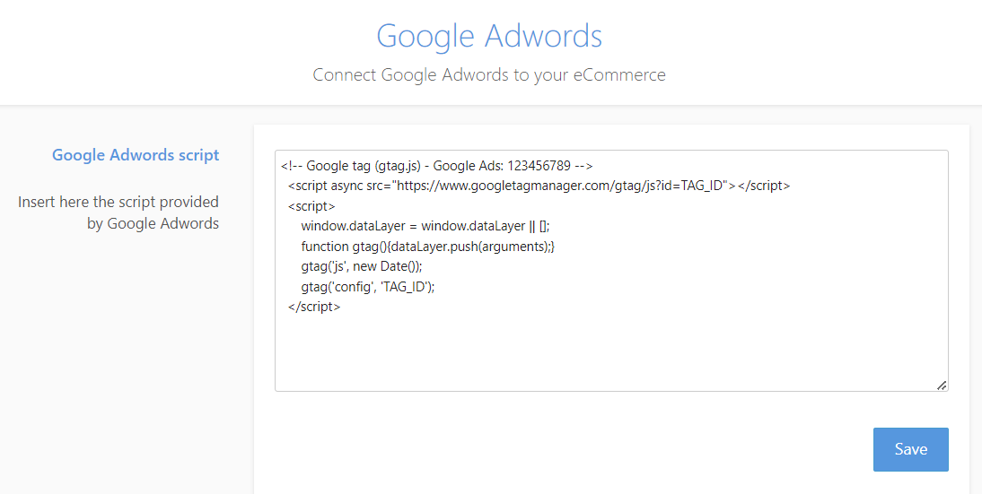 Successivamente dovrai copiare lo script che ti viene fornito nel pannello di Google Adwords ed incollarlo all'interno del box della app Google Adwords di TeamSystem Commerce (sotto un esempio):